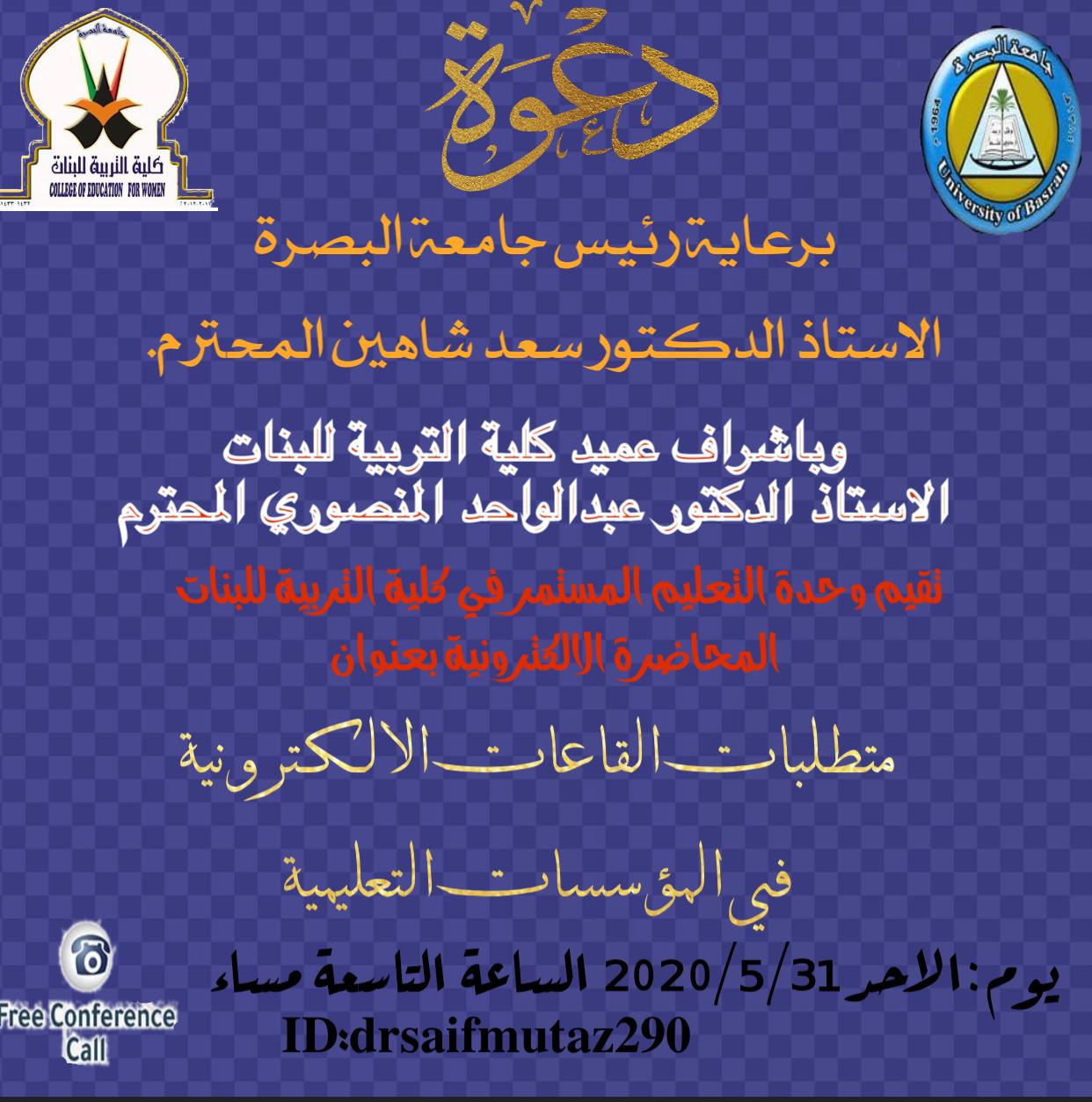 كلية التربية للبنات في جامعة البصرة تدعوكم الى حضور المحاضرة الالكترونية عن متطلبات القاعات الالكترونية في المؤسسات التعليمية