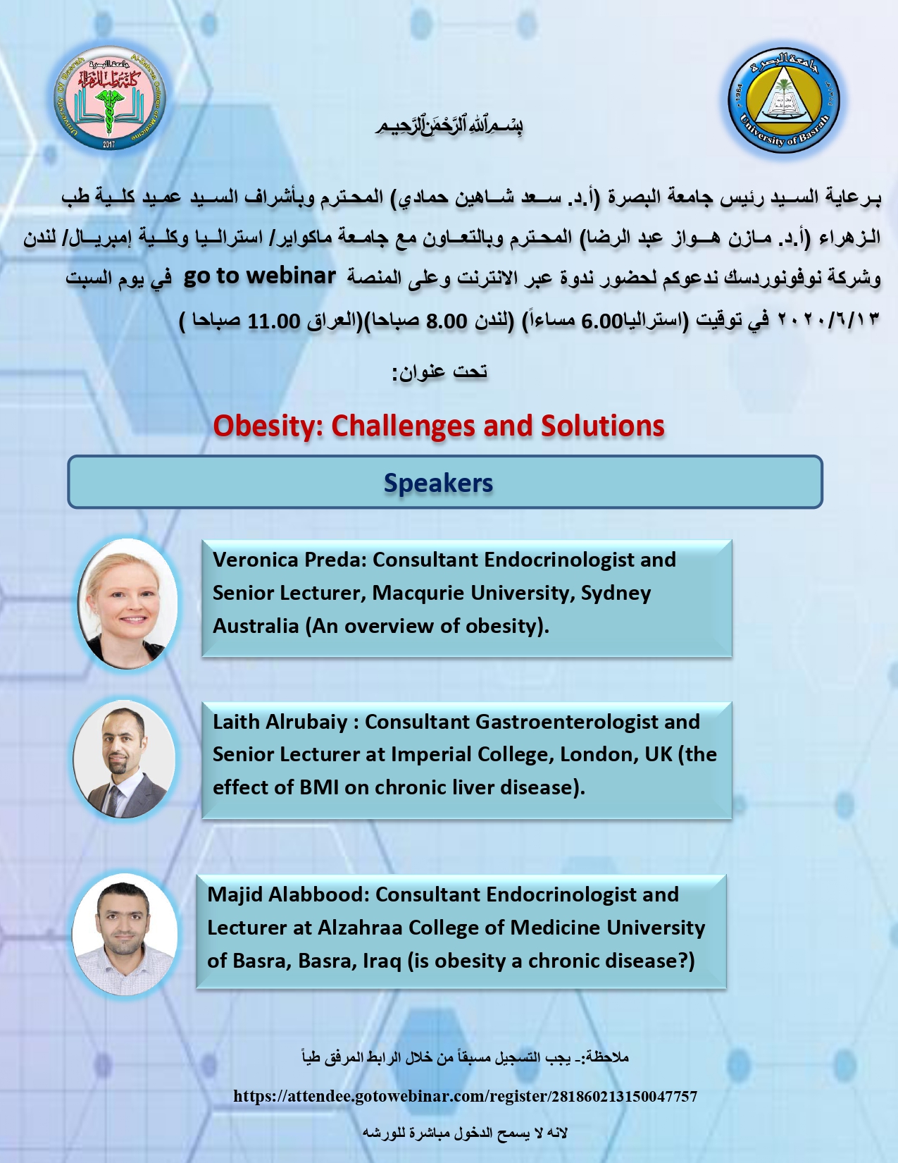 أقامت كلــــية الطب الــزهراء جامعة البصرة وبرعاية السيد رئيس جامعة البصرة الاستاذ الدكتور سعد شاهين حمادي المحترم وبإشراف السيد عميد كلية الطب الاستاذ الدكتور مازن هواز عبد الرضا المحترم وبالتعــاون مع جامـعة ماكواير/ استرالــيا وكلــية إمبريــال/ لندن وشركة نوفونوردسك ندوة علمية Obesity: Challenges and Solutions. اقيمت عبر الانترنت وعلى منصة go to webinarفي يوم السبت 13/6/2020 في توقيت (استراليا6.00 مساءاً) (لندن 8.00 صباحا)(العراق 11.00 صباحا ) وعلى التطبيق ناقشت المحاضرة الاولى التي القتها الدكتورة فيرونيكا بريدا: استشاري الغدد الصماء ومحاضر أول ، جامعة ماكواير ، سيدني أستراليا (نظرة عامة على السمنة) المحاضرة الثانية القاها الدكتورليث الربيعي: استشاري أمراض الجهاز الهضمي ومحاضر أول في الكلية الملكية ، لندن ، المملكة المتحدة (تأثير مؤشر كتلة الجسم على أمراض الكبد المزمنة) المحاضرة الثالثة القاها الدكتور ماجد العبود: استشاري الغدد الصماء ومحاضر في كلية الزهراء للطب جامعة البصرة ، البصرة ، العراق (هل السمنة مرض مزمن؟).