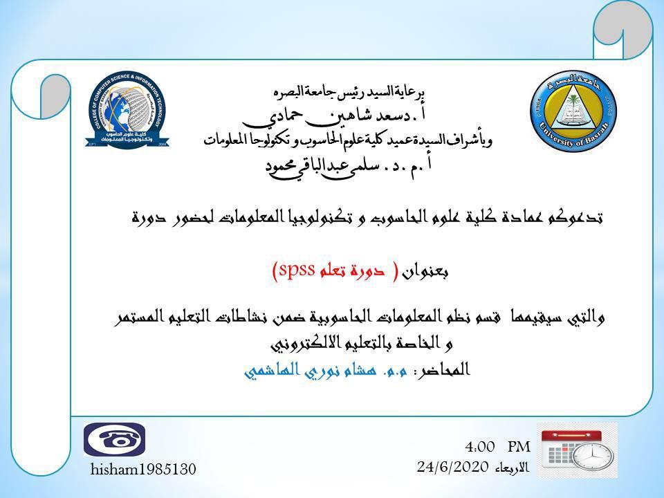 كلية علوم الحاسوب و تكنولوجيا المعلومات في جامعة البصرة تدعوكم الى حضور عدد من الورش العلمية الالكترونية