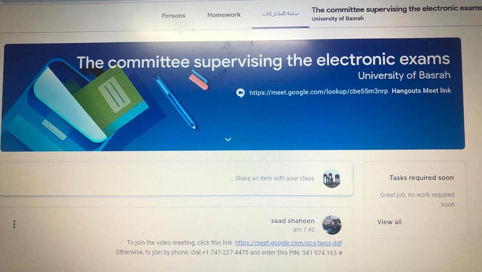 مشيراً الى ان اللجان الامتحانية اجرت ورشة عمل حول آليات الامتحان وكيفية استخدام منصة classroom وكيفية إنشاء الصفوف وإضافة الأسئلة واستلام الإجابات.