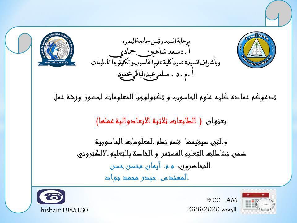 كلية علوم الحاسوب و تكنولوجيا المعلومات في جامعة البصرة تدعوكم الى حضور ورشة علمية الكترونية عن الطابعات ثلاثية الابعاد وآلية عملها
